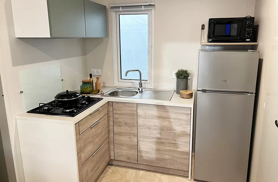 - Coin cuisine avec réfrigérateur, four micro-onde,