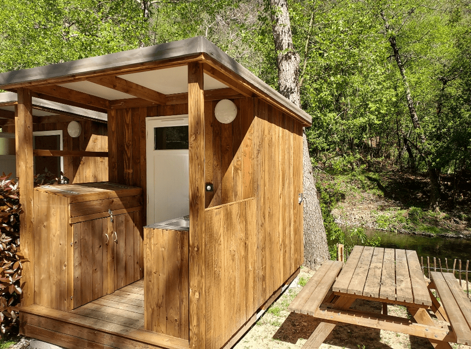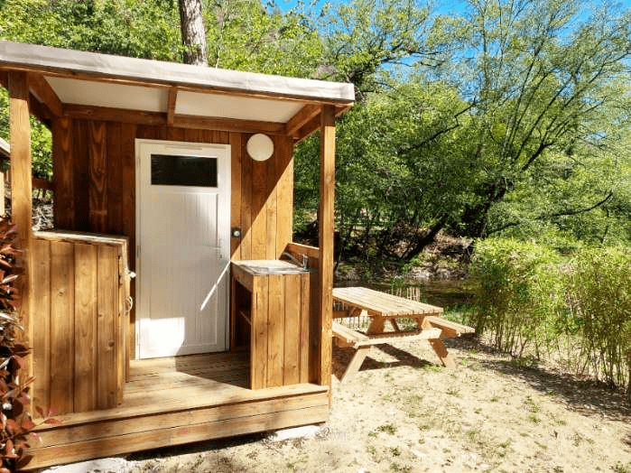 Les emplacements Premium sont pré-quipés d'un cabanon à ossature bois écologique avec sanitaires (douche + WC), et d'une table de pique-nique en bois pour plus de confort lors de votre séjour à la belle étoile.